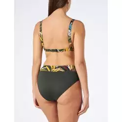 Bikini confortable avec haut à armatures pour bonnets D et culotte taille haute kaki à revers feuillage.