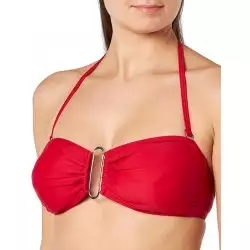 Bikini rouge haut bandeau avec bijou doré central, bretelles amovibles et culotte échancrée sur les côtés, disponible du 36 au 46.