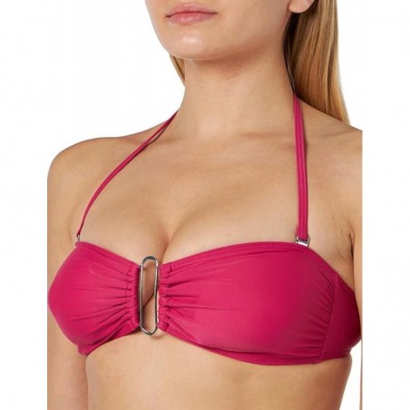 Découvrez notre bikini framboise deux pièces composé d'un haut forme bandeau avec bijou central, coques et lien amovibles associé à une culotte taille haute et échancrée pour un effet ventre plat. Disponible du 36 au 46. Convient aux bonnets B et C.