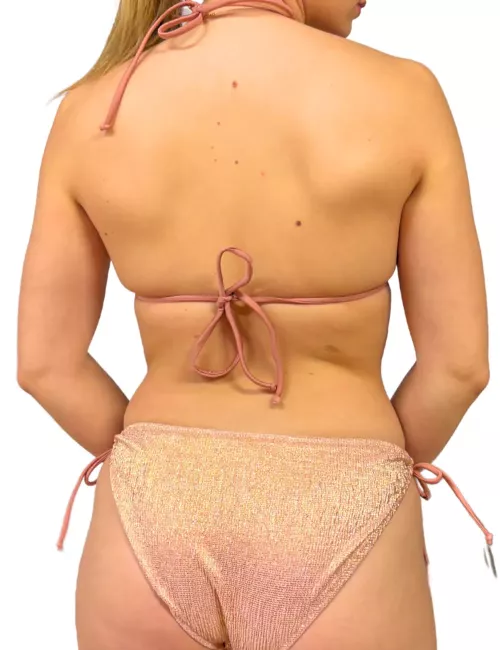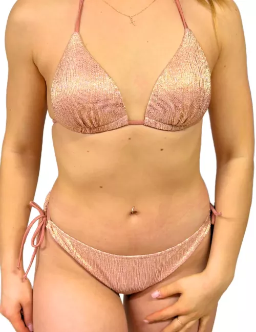 Ce bikini rose poudré au tissu légèrement pailleté est composé d’un haut triangle à coques amovibles offrant un bon maintien. Il se noue à la nuque et au dos pour s’ajuster facilement à la silhouette. La culotte assortie, réglable par des liens sur les côtés, permet un confort personnalisé et une coupe élégante. La teinte douce et brillante ajoute une touche chic à ce modèle incontournable pour l'été.