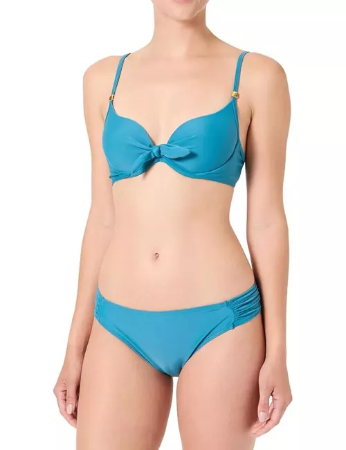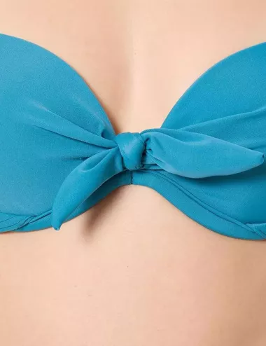 Maillot de bain deux pièces gris bleuté. Le haut est muni de coques moulées, d’un nœud central, d’armatures et de bretelles réglables à nouer dans le dos. La culotte assortie, taille classique, est froncée sur les côtés pour une finition soignée et un bon maintien. Disponible du 34 au 46.