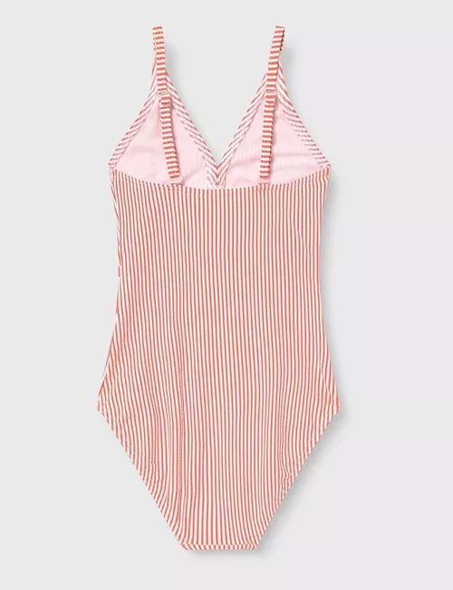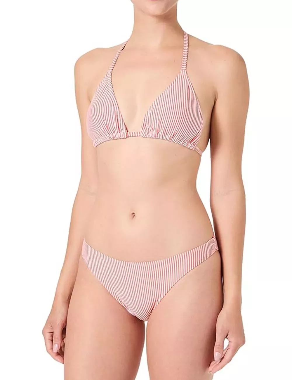 Ce bikini femme deux pièces présente un motif à fines rayures rouges et blanches, discret et intemporel. Le haut triangle se noue dans le cou et dans le dos, avec des liens fins assortis. Il offre une bonne tenue sans armatures ni coques rigides, parfait pour les journées ensoleillées à la plage ou à la piscine. La culotte assortie est de coupe classique, douce sur la peau et légèrement échancrée au niveau des hanches, pour un rendu naturel et agréable à porter. L’ensemble est doublé pour plus de confort et d’opacité, même mouillé. Un maillot facile à emporter dans sa valise d’été, pensé pour les femmes qui aiment les coupes simples et les motifs sobres.