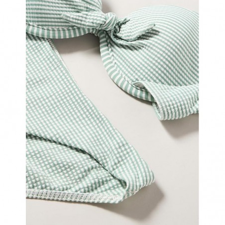 Le nœud central ajoute une touche charmante, complétée par une culotte gaufrée à la mode pour un look cohérent. Ce modèle conjugue avec brio la tendance nautique et le confort, assurant une allure élégante sur la plage ou au bord de la piscine, disponible en tailles 36 à 46.