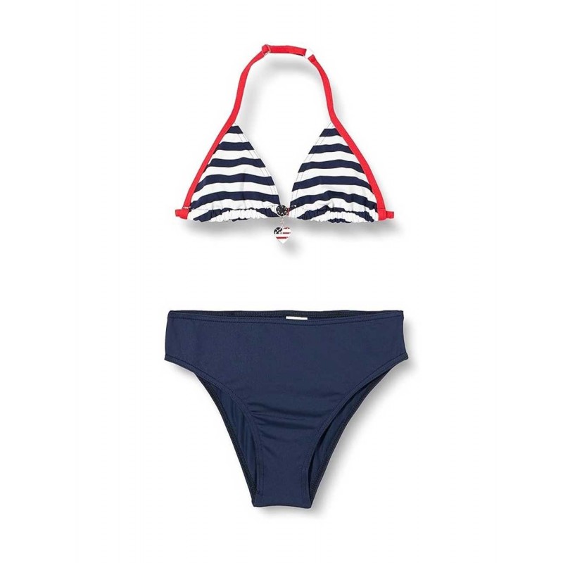 Ensemble de maillot de bain deux pièces pour fillette rayures bleus et blanches avec détails rouges, haut en forme triangle avec bijoux et culotte classique marine. Disponible pour les 6 à 16 ans.