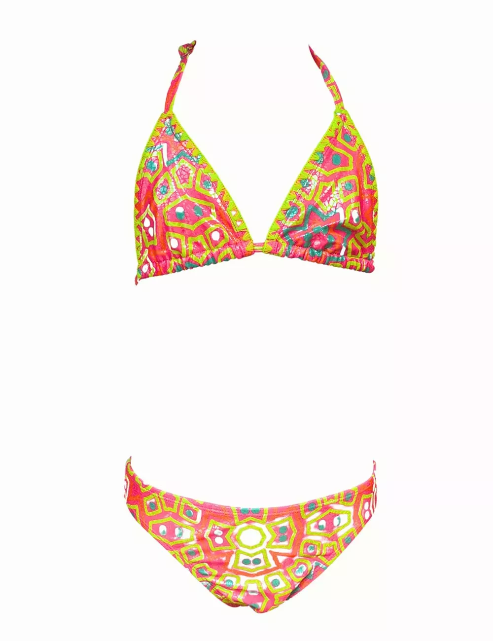 Maillot de bain deux pièces fille, coloré et tendance, avec imprimé géométrique rose, jaune et touches de turquoise. Disponible du 8 au 14 ans.