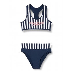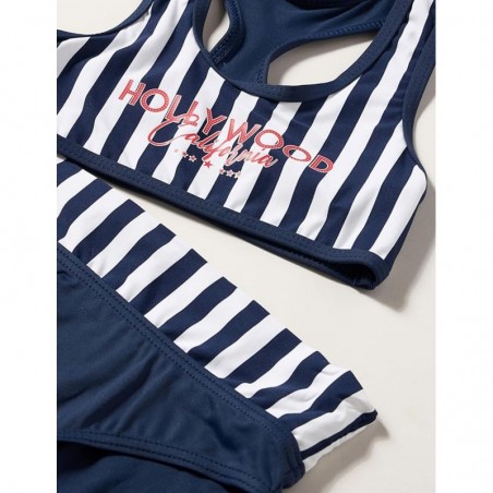Inspiré par les vagues et les éclats du soleil sur l'océan, cet ensemble deux pièces capture l'essence des journées en bord de mer. La brassière, avec ses rayures bleu marine et blanches, est rehaussée d'une inscription rouge qui apporte une touche de dynamisme. La coupe dos nageur et les bretelles non réglables offrent un maintien sûr pour toutes les activités aquatiques, qu'il s'agisse de construire des châteaux de sable ou de plonger dans les vagues.