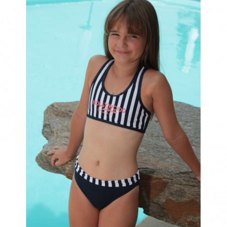 Maillot de bain deux pièces fille avec haut triangle et bretelles réglables. Rayures orange et blanches, culotte classique.