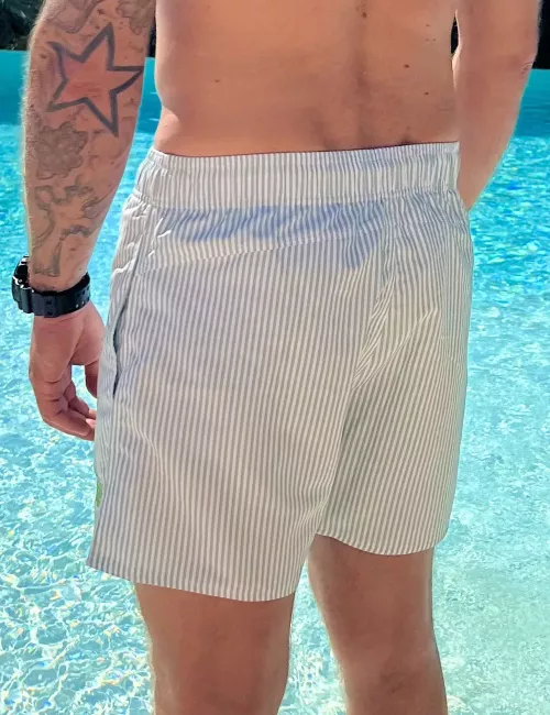 Boardshort homme rayé vert et blanc, taille élastique avec cordon de serrage, poche arrière pratique, tissu confortable et séchage rapide.