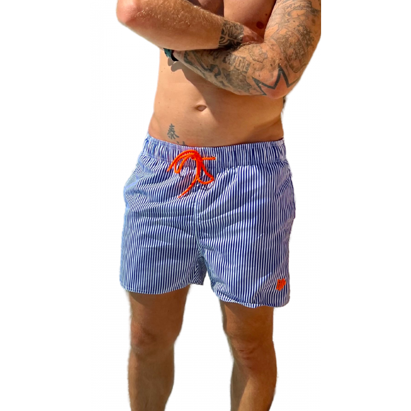 Boardshort de Surf Homme à Rayures Bleues et Blanches avec Logo Orange Fluo du S au XXL