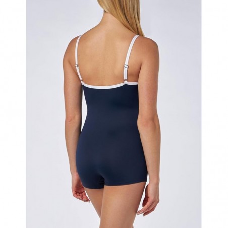 Découvrez notre combishort gainant en coloris marine avec des liserés blancs, doté de bretelles réglables pour un confort optimal. Disponible en tailles 36 à 54.