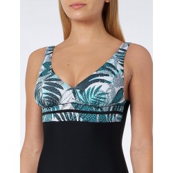 Laissez-vous séduire par l'élégance et le confort du maillot de bain une pièce noir avec motif feuillage vert sur poitrine. Conçu pour sublimer votre silhouette, ce maillot offre un effet gainant grâce à sa bande sous poitrine et à sa coupe ajustée. Le décolleté en V met en valeur le buste, tandis que le dos échancré ajoute une touche de sensualité. Les larges bretelles fixes assurent un maintien parfait.