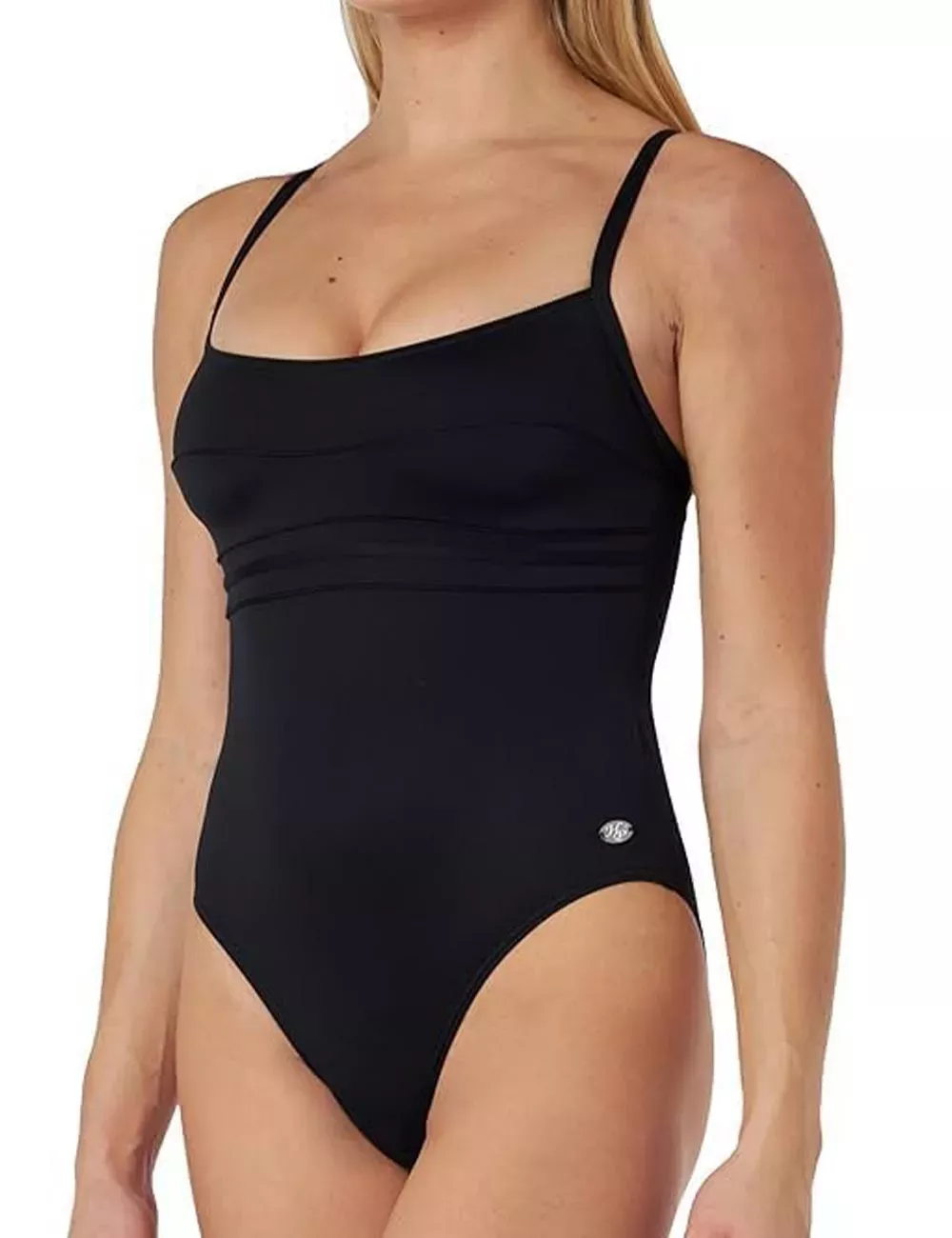 Découvrez notre maillot de bain une pièce noir avec amincissant et gainant. Conçu avec un décolleté et dos droit, bretelles réglables et bande sous poitrine. Disponible en bonnet C et en tailles 36 à 48.