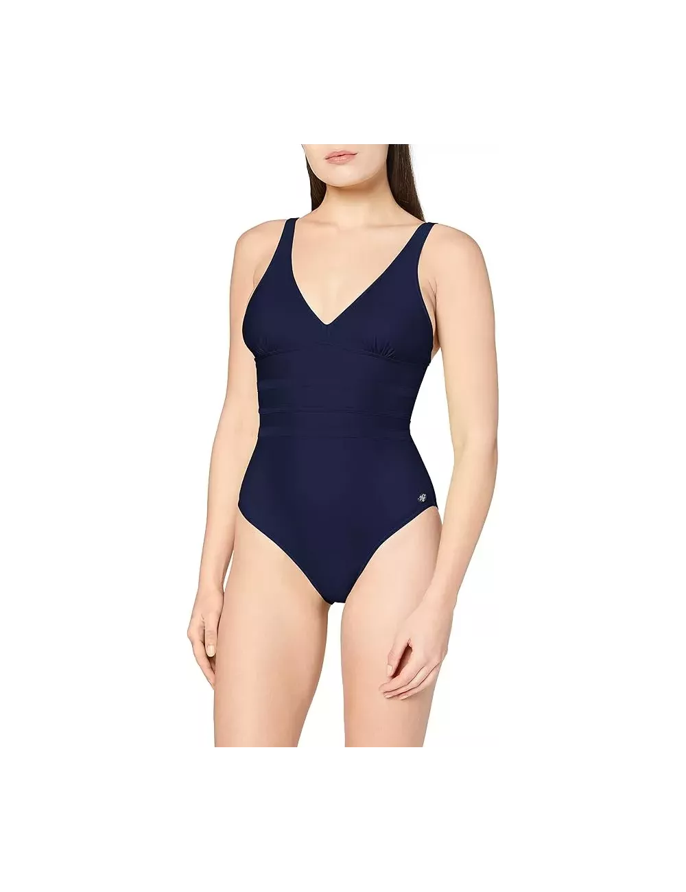 Maillots de bain femme 1 piece HAUTE PRESSION décolleté V uni marine avec bandes contrastées ton sur ton sur le devant, brettelles réglables, dos droit, 1 pièce doublé devant